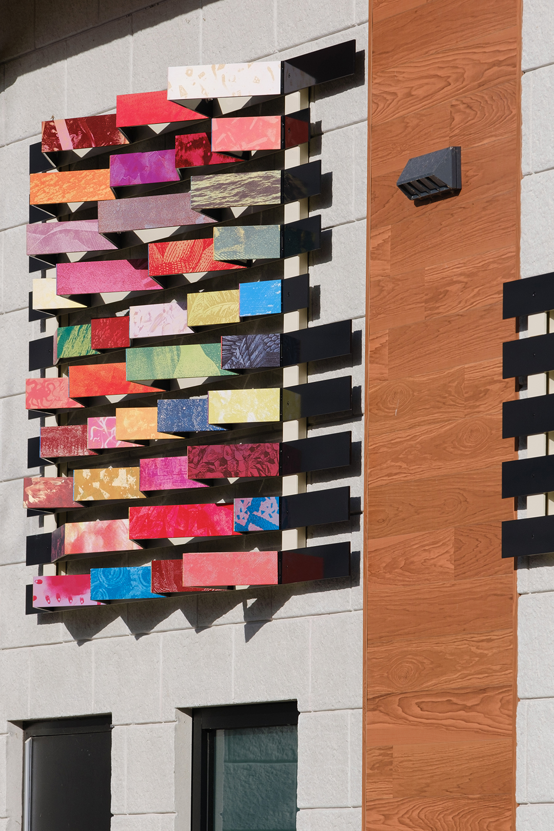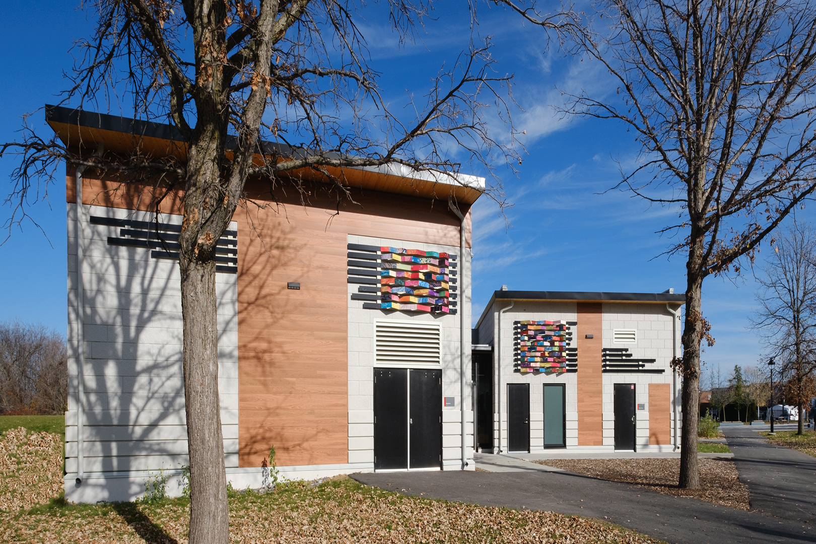 The work Au diapason was created for part 3 of the Programme d’art mural, funded by the Entente sur le développement culturel de Montréal, an agreement concluded between the Ville de Montréal and the Gouvernement du Québec. It was integrated into the project for construction of a chalet in Parc Armand-Bombardier, in the Rivière-des-Prairies neighbourhood.
