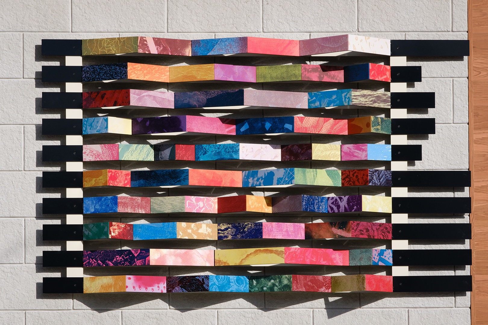 Both art interventions are situated at the main entrance to the chalet in Parc Armand-Bombardier, which faces the boulevard of the same name. The works are composed of broken coloured bands in relief, complemented by long black planks that echo the horizontal motifs of the building’s roof and back terrace.The artwork’s title refers to the expression “se mettre au diapason” (to get in tune), which means to be in a state of mind in sync with others and with the present moment. The elements of the work that evoke coloured undulating waves express the exaltation that one might feel during activities, encounters, and cultural events. They symbolize the social resonance and connection that can be created among people during such shared moments. The black lines represent trajectories. Whether they refer to people, organizations, cultural groups, or other entities, these lines begin to pulsate in a separate space that might represent the chalet or any other place where people get together to be creative or have a collective experience.