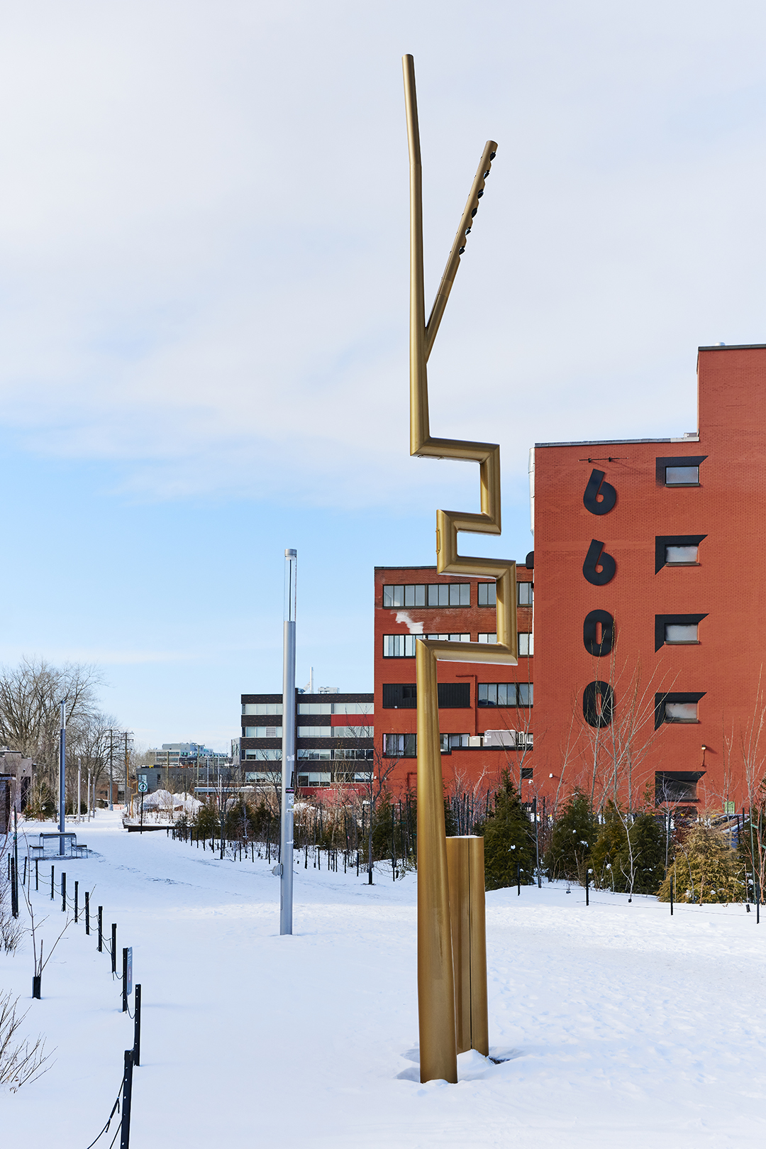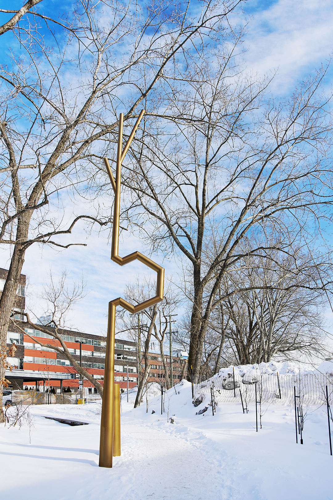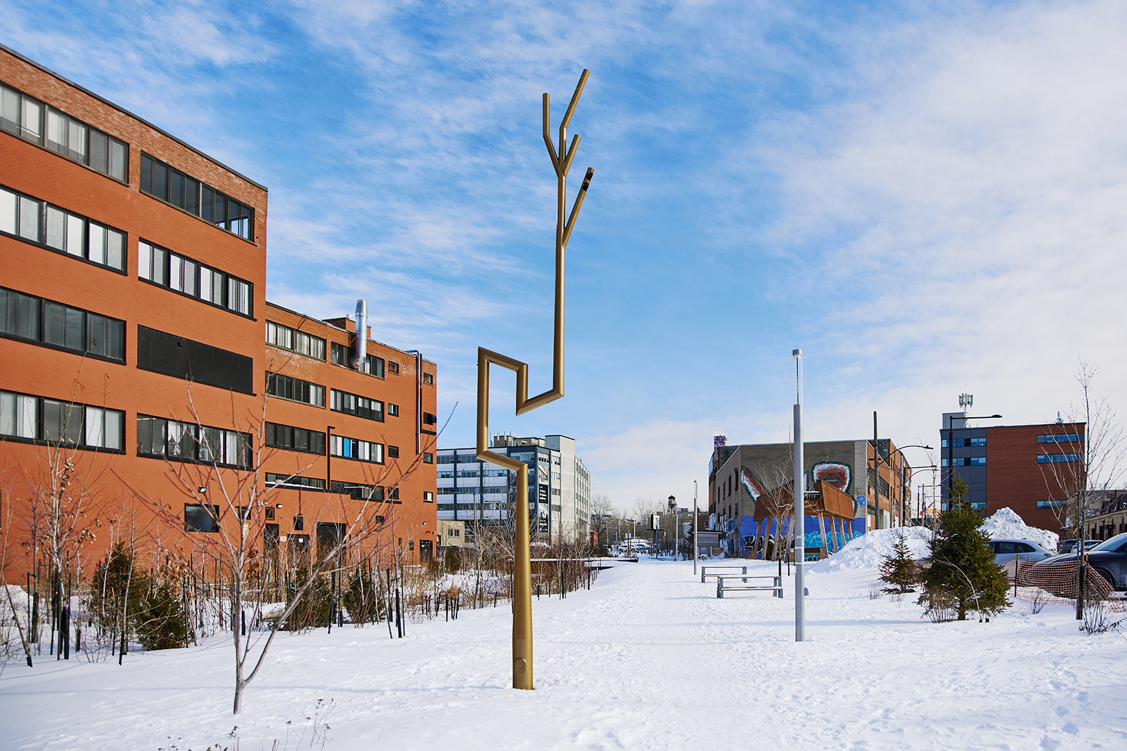 Les embranchements fructueux est une installation sculpturale numérique en trois parties implantées le long du sentier qui traverse le parc des Gorilles. Natacha Clitandre réalise la conception sculpturale et visuelle de l’œuvre tandis que Salima Punjani en signe la conception sonore. Inspirée de l’histoire du site et de la mobilisation citoyenne liée au parc, l’œuvre donne la parole aux AmiEs investis dans la sauvegarde de la friche. Aux deux entrées du parc, des bornes interactives diffusent des sons et témoignages sélectionnés au terme d’une collaboration avec les AmiEs du parc. Les bruits de machines à coudre, du train, des chants d’oiseaux et des voix évoquent la coexistence harmonieuse des différentes fonctions du site au fil du temps. Les formes des sculptures hautes ont été conçues à partir du L-Système, un algorithme qui permet de représenter visuellement le processus de croissance des plantes. Semblables aux arbres du parc, ces sculptures témoignent de l’hétérogénéité de la flore tout autant que de la richesse du patrimoine arboricole et industriel du parc. Les artistes remercient Olivier D. Asselin, Nathalie Barbeau, Martone Donde, Frances Foster, Mathilde Geromin, Trevor Goring, Erwan Jouault, Kae Loah, Maria Patricia Lucas, Alexandra Nadeau, Christian Scott et Simon Van Vliet pour leur contribution au projet.